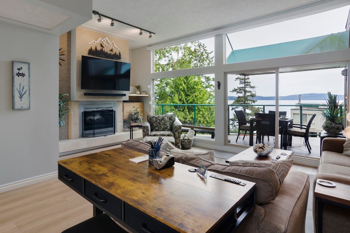 Welcome to the desirable Vesuvius Bay neighbourhood. Enjoy morning coffee overlooking the ocean and unforgettable sunsets from this top floor, corner suite condo. Stylish and cozy with two bedrooms, two full bathrooms, kitchen with breakfast bar, a separate dining area and a living room with fireplace and patio doors that open onto a terrace. This idyllic all-season condo is a five minute walk to Salt Spring's warmest swimming beach, a quaint village store, oceanside restaurant and wharf.