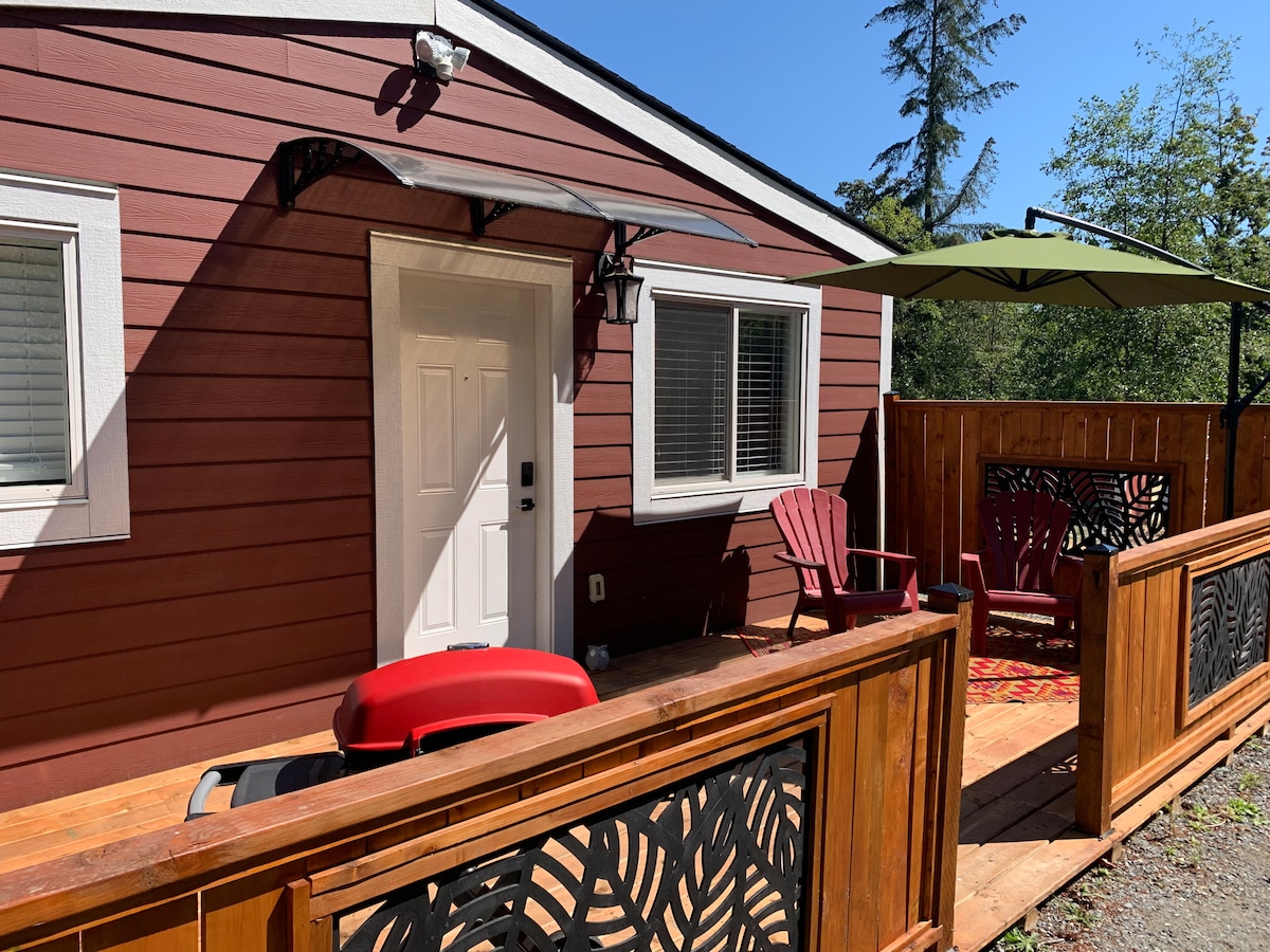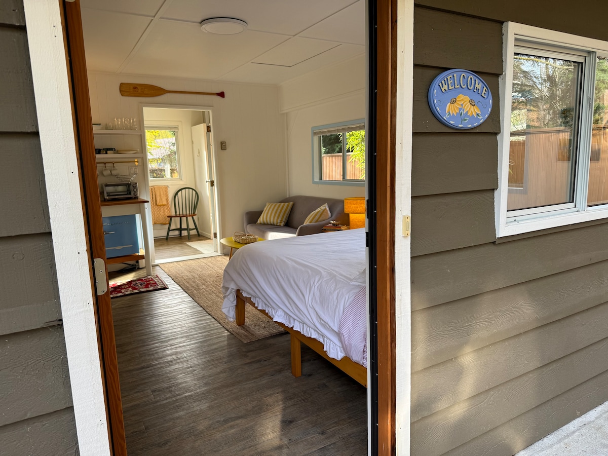 Welcome to our cozy, art-filled studio in Duncan, Cowichan Valley. Whether you're here to relax or explore, it's the perfect home base. The suite is beside our home, with full privacy. Enjoy a deck, hammock, and year-round private hot tub. Inside, full-equipped kitchen with granite counters, a propane range, and a bar fridge. It sleeps four with a queen Murphy bed and a queen loft bed, both with organic sheets. Stay comfortable with radiant floor heating, a rustic fireplace, and AC for summer.