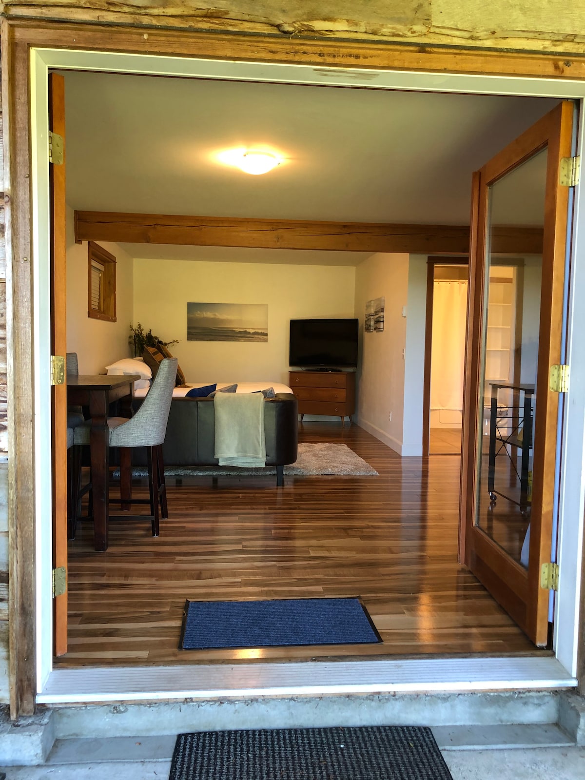 Comfortable and warm garden studio a 3 minute walk to the best beach on Salt Spring,a 10 minute drive to Ganges and a short walk to a beautiful forested area. Stylish furnishings, soaker bathtub and Netflix on the TV, makes this the perfect base for your island adventure. It has its own private entrance and covered patio. The suite is in a house where the host family lives, so guests may hear occasional footsteps. Paddle board rentals available and I transport to beach or lake for you.