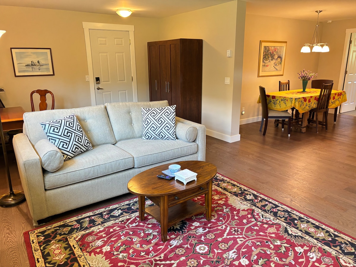 Located in the sunny Vesuvius area of Saltspring Island. Recently built, cozy, Bed and Breakfast Suite. Quiet, south-facing location with views over meadows and the mountains of Vancouver Island beyond. Partial ocean view! The suite features a living area with TV and comfy couch & chair. There is a queen bed and deluxe private bathroom. The suite is connected to the main house, but it has its own expansive deck and a private entrance.