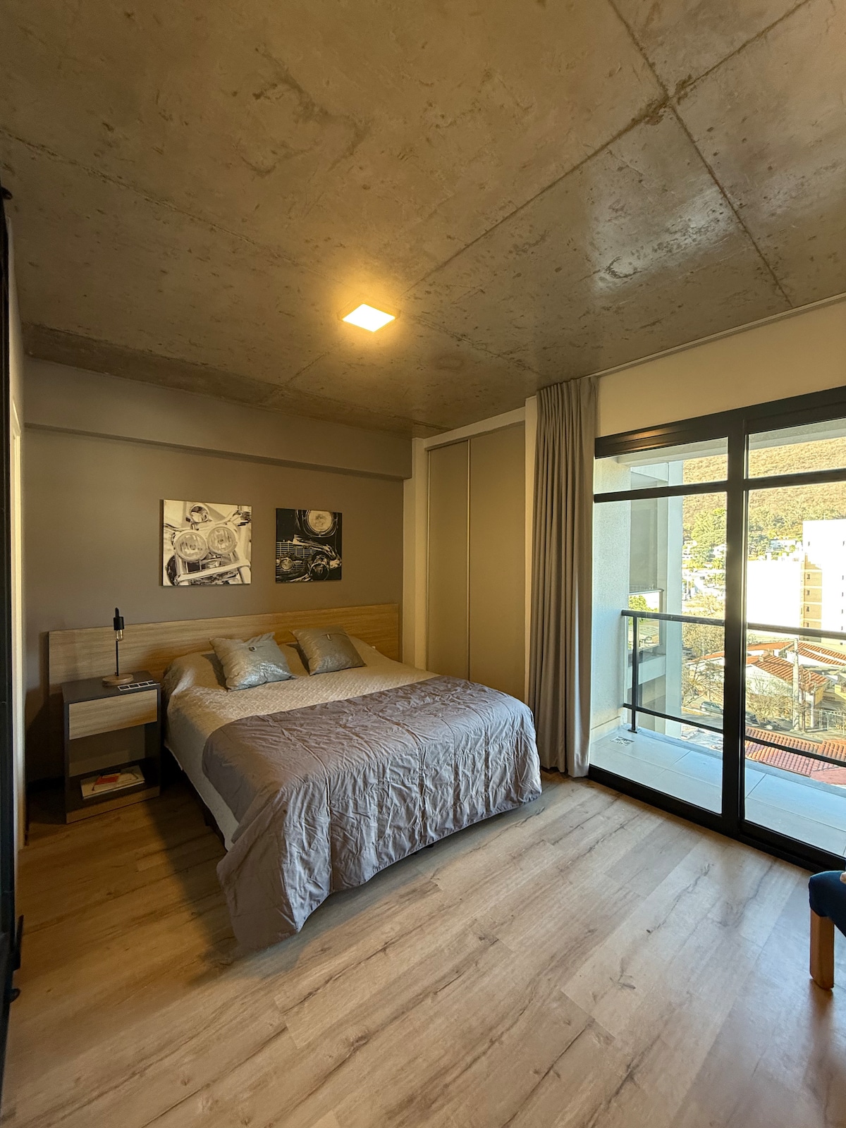 Excelente monoambiente en el último piso del Edficio DFC con excelentes vistas a los cerros y la ciudad de Salta, tiene cocina completa, baño completo, aire acondicionado, tv por cable y sistema smart, wifi, una cama King size o dos camas individuales, ropa de cama, toallas. El edificio cuenta con piscina exterior, gimnasio y quincho con asador (este último a petición y con cargo).