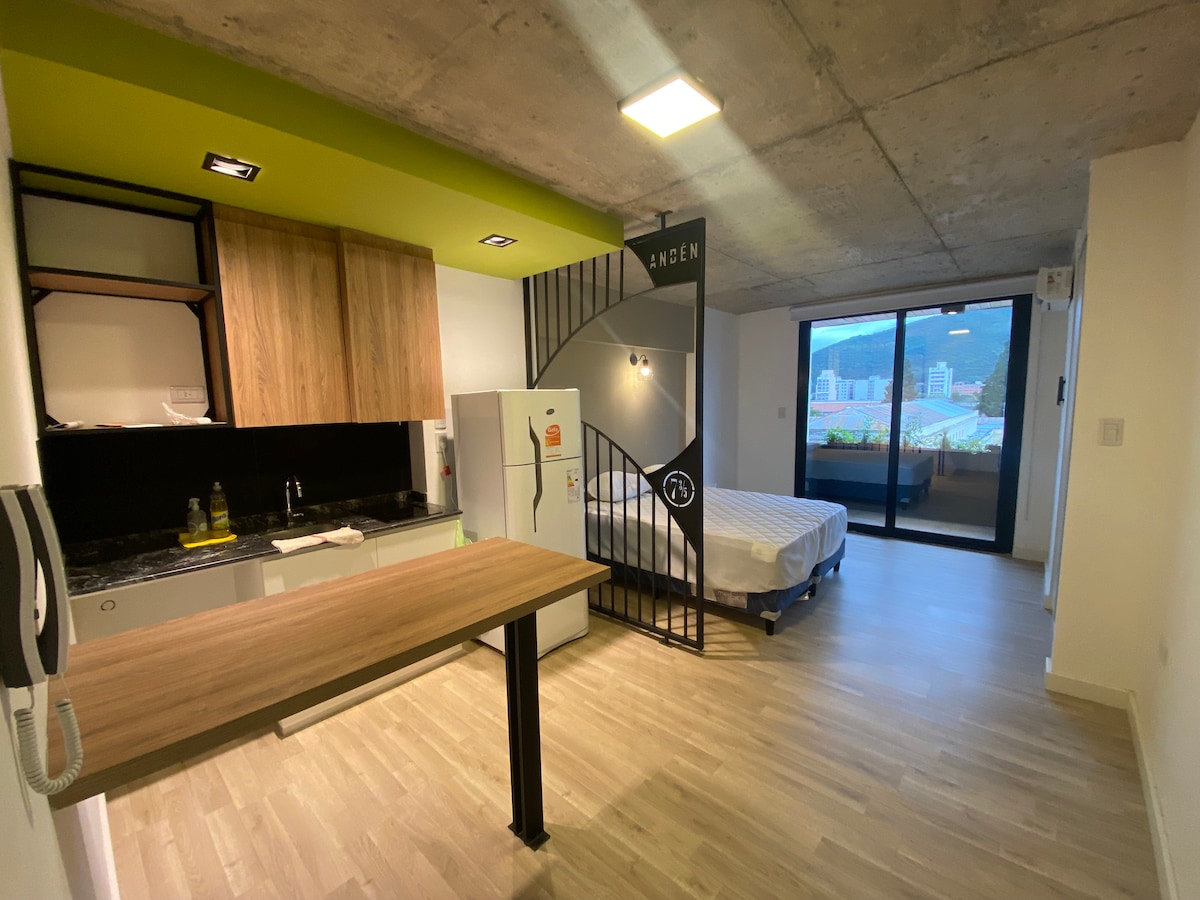 Descubrí nuestro monoambiente especialmente diseñado para una estadía cómoda y sin complicaciones. Equipado con cama Queen, aire acondicionado frío/calor, Wi‑Fi de alta velocidad, Smart TV y kitchenette con heladera y anafe, cuenta con ropa blanca completa y baño privado. Ideal para una experiencia de vida moderna y práctica, cerca de zonas gastronómicas y con acceso a piscina, gimnasio, coworking y seguridad las 24 hs. Perfecto para nómades digitales, estudiantes o profesionales en tránsito.