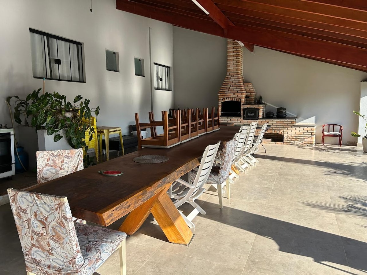 Casa de campo tranquila e segura com 6 suítes, sendo 4 localizadas em uma casa independente. Churrasqueira, piscina, horta, pomar, cozinha na casa principal e mini copa na casa secundária disponíveis. Condomínio com quadra de futebol, quadra de tênis, quadra de basquete e academia. Casa com wi fi, televisão e sistema de som.