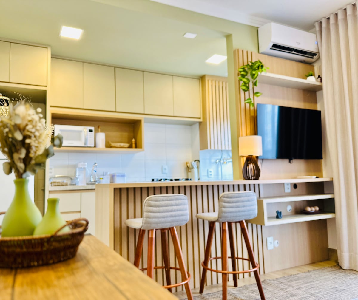 Flat disponível para você se hospedar em Indaiatuba e desfrutar de uma experiência maravilhosa na cidade. Ambiente conta com uma disposição moderna e aconchegante, oferecendo todos os utensílios necessários para que sua estadia seja excepcional. O Flat dispõem de um cozinha (cooktop, microondas, geladeira, utensílios de cozinha, louça), uma suíte (TV smart, cama Queen size, ar condicionado, rouparia completa, travesseiros, secador), uma sala de estar (smart tv, mesa, sofá) e uma sacada.