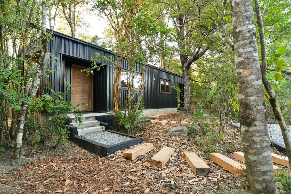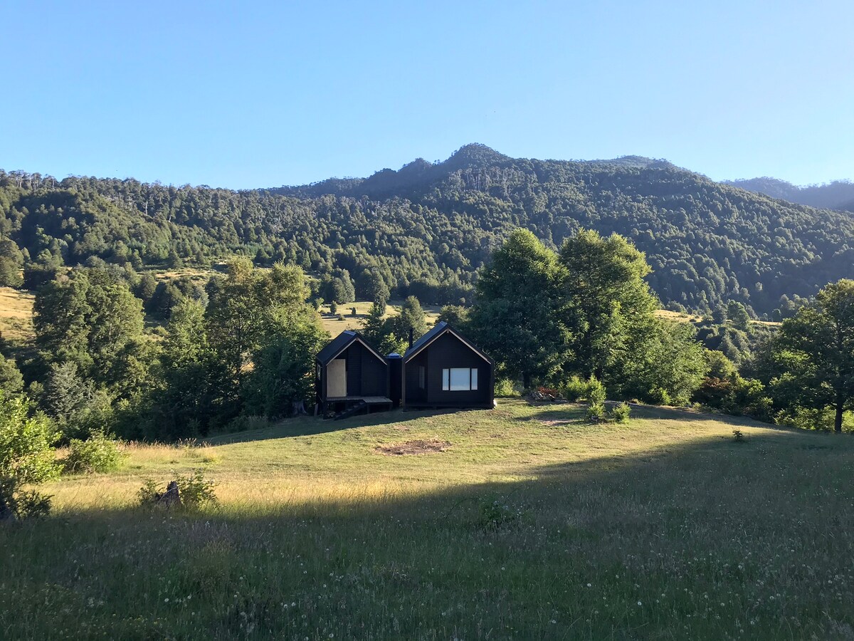 The cabin has a natural feel and rustic touch within amazing surroundings of the native forest and trees all around you. The cabin has been built with native and sustainable wood. it is well equipped. Is very cute and cozy space with a large veranda with an outdoor seating. There is a nice river with access within the property with a picnic table next to it to enjoy listening the river. Big sunny green garden, picnic table to enjoy the view of the mountains, a fire-pit and couple of hammocks.