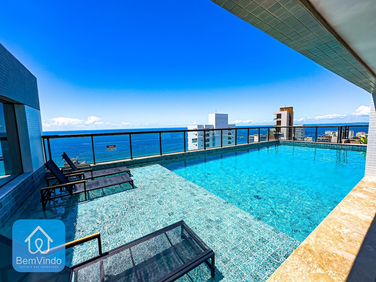 Accommodates 2 guests. Ocean view, in the best location for Carnival, with an outstanding view of the entire Oceanic Avenue all the way to Barra Lighthouse. Modern building featuring a swimming pool, gym, Seven Wonders Restaurant on the ground floor serving a delicious and highly sought-after breakfast (paid separately), mini-market, 24-hour front desk, and stunning architecture. Staying in this unit grants free access to the Blue Praia Bar, one of the best beach clubs in Salvador.