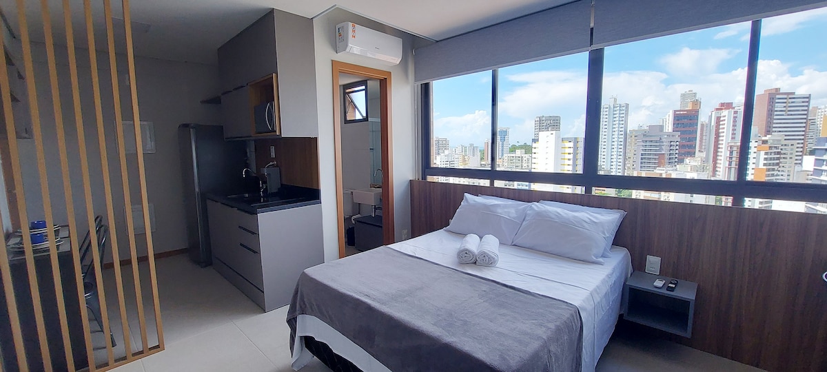 Lovely apartment with stunning ocean views, overlooking Salvador's main landmarks. From the balcony, besides the beautiful view of the All Saints Bay, you can admire the Bahia Marina, the Lacerda Elevator, the Solar do Unhão, and the São Marcelo Fort. The space is elegantly decorated, with environments equipped with everything you need, including a balcony with magnificent views. The bedroom features a comfortable queen-size bed, while the living room has a double sofa bed.