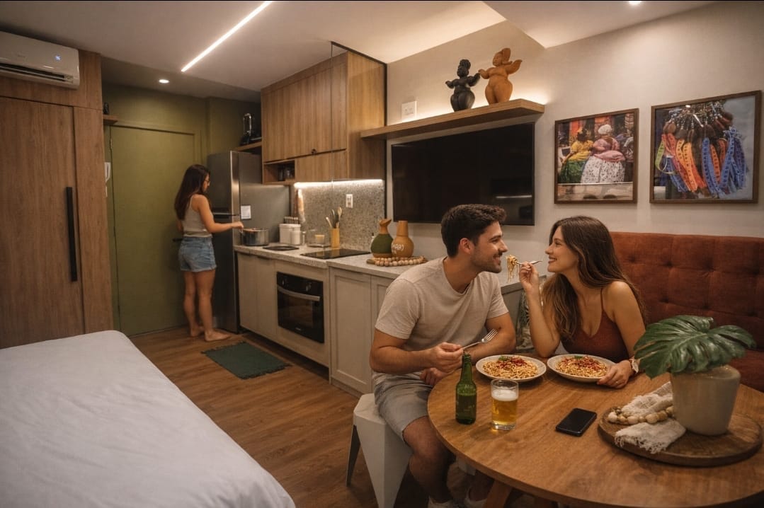 Enjoy a modern, cozy, and beautifully decorated studio located right in front of Armação Beach. The space features a double bed, a fully equipped kitchen, fast Wi-Fi, and everything you need to feel at home. The building is new, secure, and full of charm – with contemporary architecture, well-designed spaces, and an artistic vibe that makes a great first impression. Ideal for couples, friends, or business travelers. Come experience Salvador with comfort and convenience.