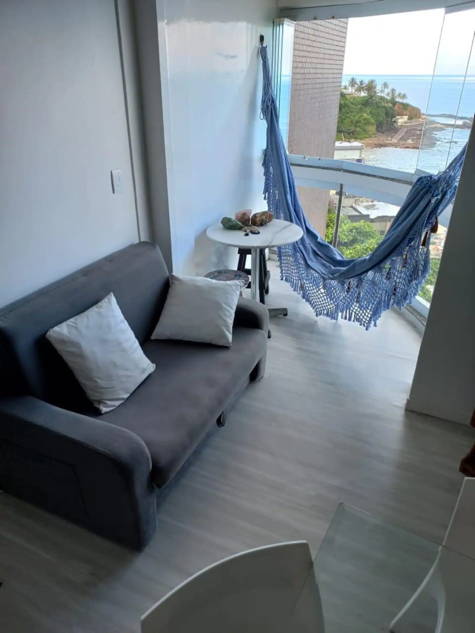 Cozy apartment with a stunning ocean view, situated just one block from Barra Beach. Two bedrooms decorated with well-equipped spaces and an integrated balcony with a lovely view. One suite with a queen-size bed, the second bedroom with two single beds, and a sofa bed in the living room. Located in Barra, with easy access to the city's main tourist attractions. During your stay, count on our warm and personalized service!
