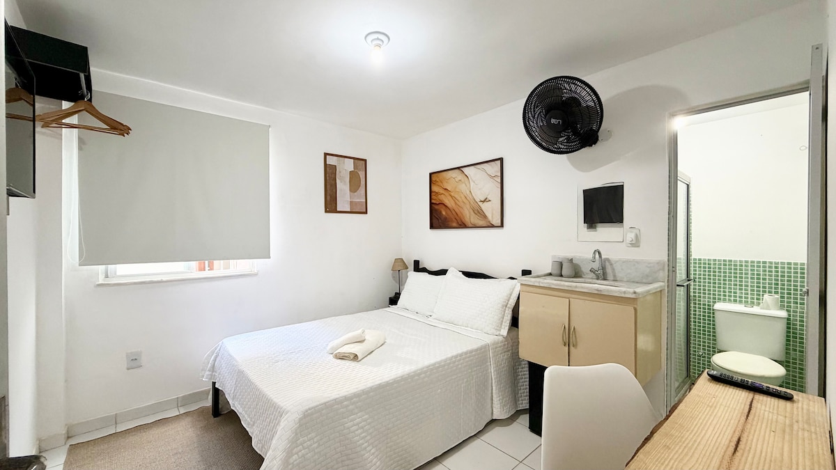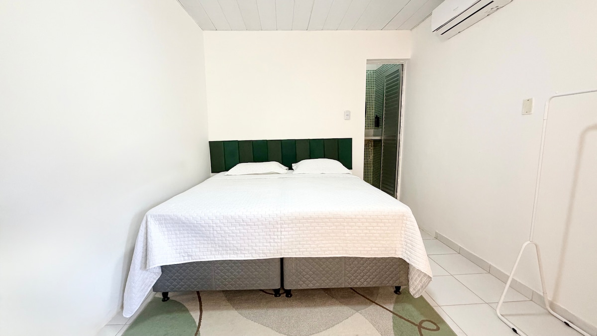Studio de 50 m², com cama queen size, ar condicionado, TV, wifi, closet, sofá, mesa para refeições, banheiro e varanda. Situada num condomínio bucólico, bem sossegado, com ares de interior, mas pertinho de tudo.