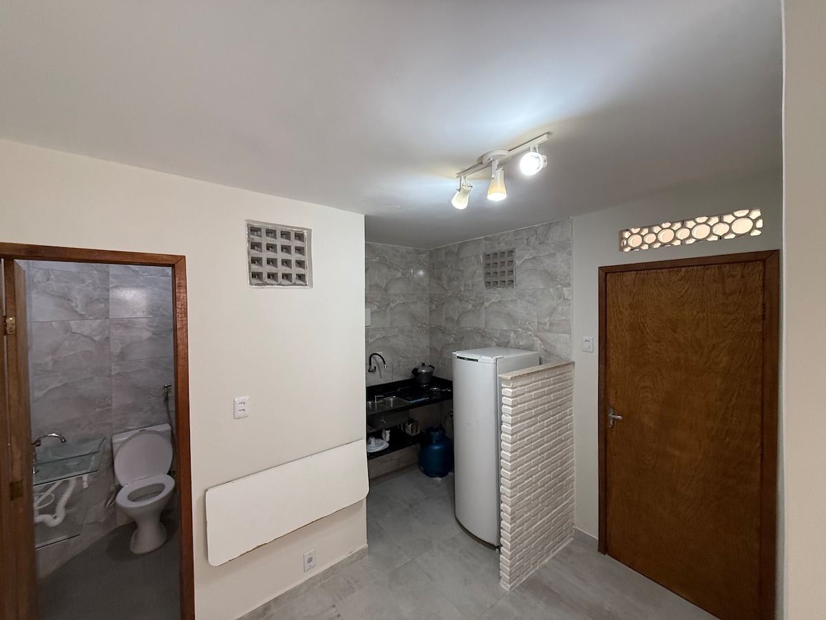Este lugar único tem um estilo próprio. Conforto, praticidade e tranquilidade em um só lugar. Nossa acomodação gera um ambiente acolhedor, ideal para casais ou viajantes a trabalho. O espaço é climatizado, bem iluminado e totalmente equipado para uma estadia agradável. Quarto com cama queen, ar cond, TV, wi-fi de alta velocidade e armário. Sala com sofá cama. Banheiro privativo com chuveiro quente e toalhas. Cozinha completa com geladeira, fogão, micro-ondas e utensílios. Estacionamento gratuito