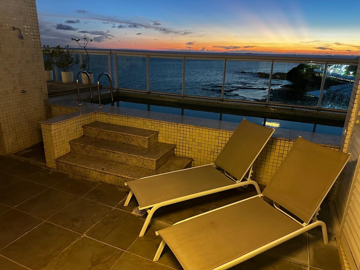Cobertura duplex climatizada com vista total mar, pé na areia, infraestrutura completa e com vista privilegiada do maior carnaval do mundo!!! Localizado no Costa Espana com vista para o por do sol no Farol da Barra! Condomínio com total infraestrutura com academia, sauna, jacuzzis, sala de squash, garagens, piscinas, parque infantil, acesso exclusivo à praia, MCDonalds ao lado do condomínio!