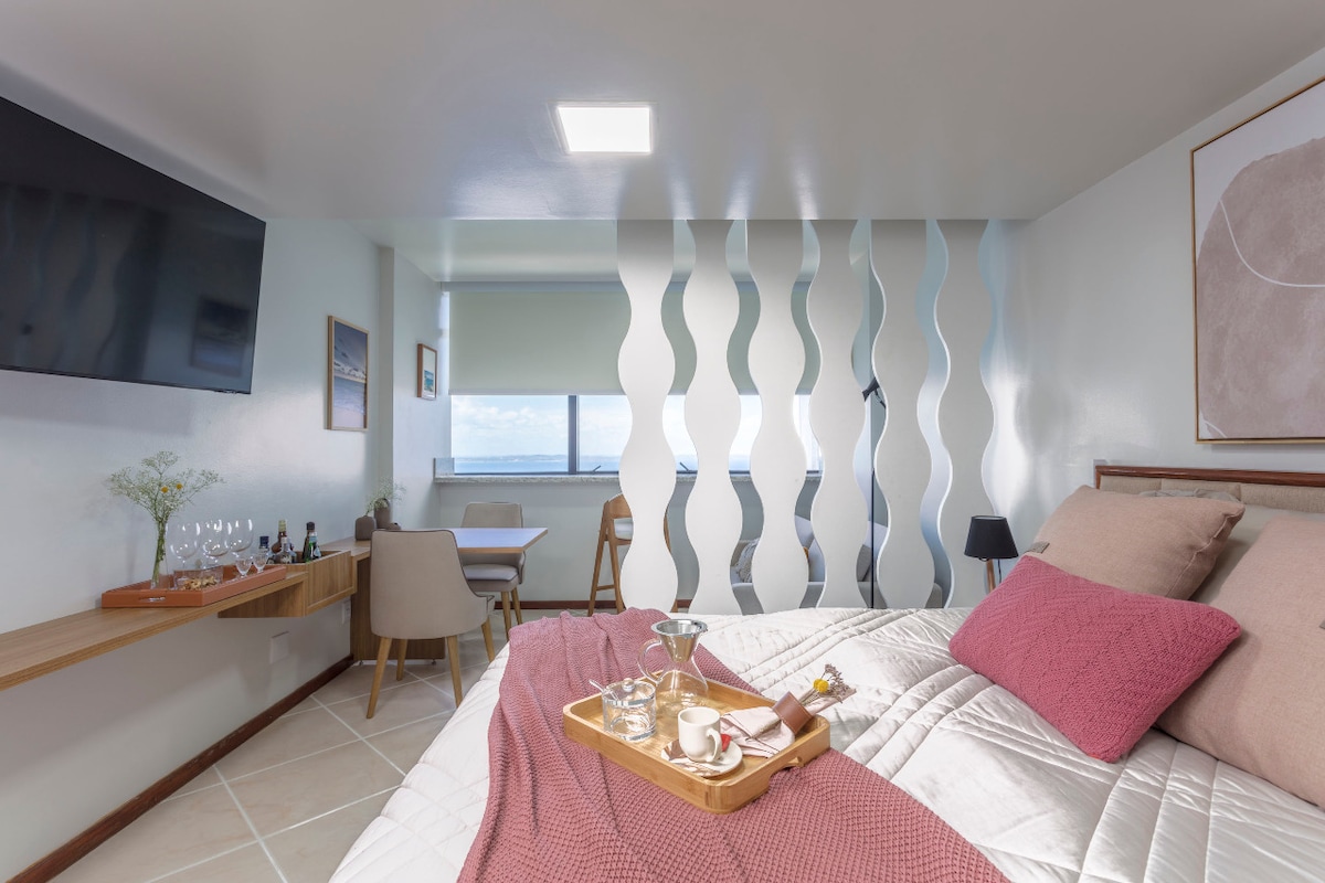Flat mobiliado frente-mar, confortável e funcional, ideal para temporada. Ambiente completo com ar-condicionado, TV, mesa de trabalho e sofá-cama. Cozinha equipada com frigobar, micro-ondas, forno de indução, cafeteira, sanduicheira e utensílios. Possui duas cortinas (elétrica e manual com bloqueio solar), garantindo conforto, privacidade e bem-estar. Perfeito para relaxar ou trabalhar com vista para o mar.