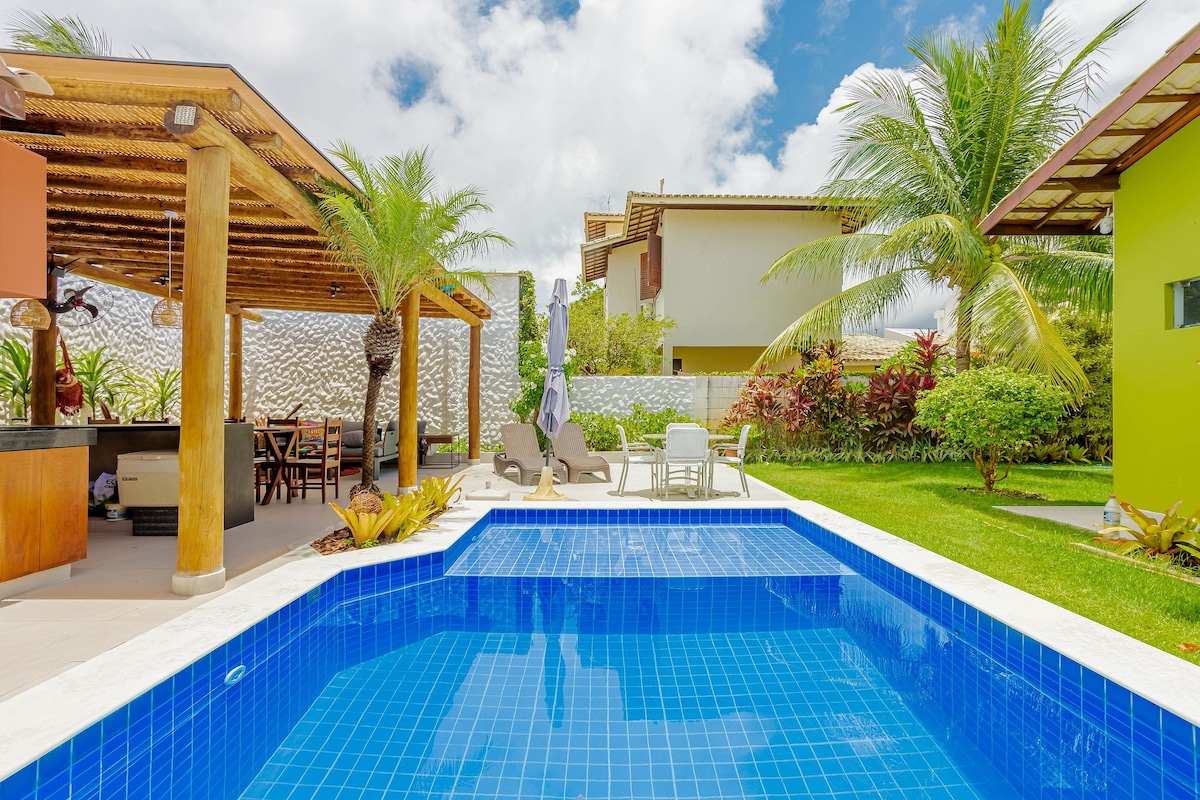 House 2 min walk to a beach with Blue Flag; 158 m 5 en-suites with AC, closets and 100% blackout for 10 (4 double and 2 twin beds) Swimming pool, BBQ, garden, dishwasher Daily pool and house cleaning included, except on Sundays HS Internet 500 mb Community security w/ cameras and 24/7 patrol; access to the house monitored Bike path with ocean view, sports courts Max 10 guests older than 2 years old Energy & water consumption covered up to R$40/day. Excess will be charged on checkout.