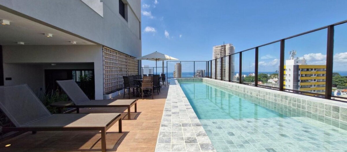 Comfortable and modern Flat on the beach, fully renovated and furnished, privileged location, close to bars, restaurants and all the bustling nightlife of Barra. The Flat has a swimming pool with the best view of Farol da Barra beach, in addition to a daily cleaning and housekeeping service, silent split air conditioning, 50” Smart TV and Wi-Fi. Situated in front of the delightful natural pools of Praia da Barra (just cross the street) and with a beautiful shore to stroll around.