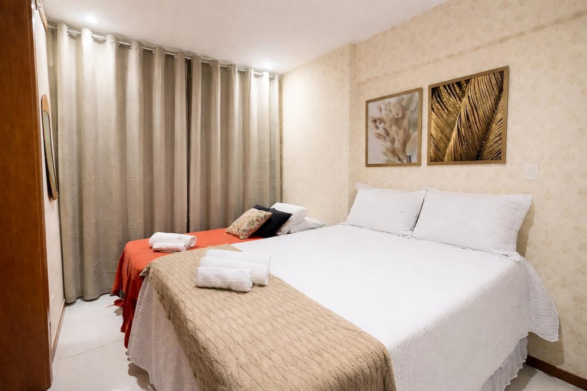 Nosso cantinho foi idealizado para ganhar o seu coração ❤️ Dispomos de travesseiros extras, excelentes jogos de cama e banho (o chuveiro tb é maravilhoso), telas de proteção nas janelas, Internet de 500 mega, espaço de trabalho, 2 TV’s smart, 2 ar-cond. split. É possível acomodar até 4 pessoas, sendo 2 no quarto (cama queen) e 2 na sala (sofá-cama), tudo de primeira! A cozinha é minuciosamente equipada e a varanda convida você a recarregar as energias contemplando um pôr do sol incrível!