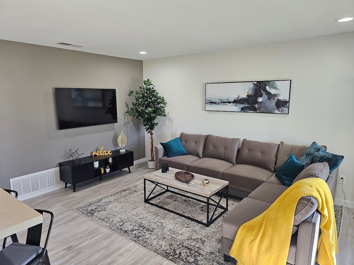 Welcome to our home, Enjoy: - 75" 4K Roku TV with Netflix, Prime, Hulu, Disney+ - 1 queen bed and 1 sleeper sofa (queen size) - Luxurious rainfall shower and modern bathroom - Fully equipped, stocked and clean Kitchen - Washer Dryer - Dedicated, Fast and secure WiFi (300 Mbps) - Dedicated Workspace with dual monitor. - Self-check-in - Spacious closets - Steamer, Hairdryer, sanitizers - Dimmable warm lights for ambiance - Level 2 EV charger. - Convenient location near ECRMC, and shopping stores.
