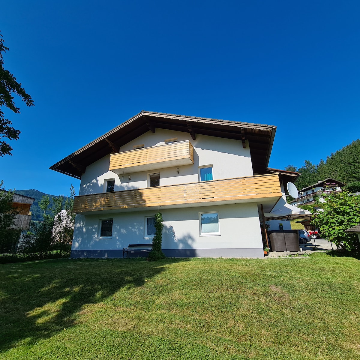 Genießen Sie schöne Tage im Kaiserhaus mit Garten & wunderbarem Blick auf die Berge. Ein 200 Jahre altes Holzhaus wurde hier in der Nähe abgetragen und neben meinen Haus wieder aufgebaut. Das neue (alte) Holzhaus wurde sehr ökologisch und auf neuestem Stand wieder hergerichtet. Dieses Studio wurde fast nur mit altem & neuem Holz ausgekleidet - man sieht noch die alte Handwerkskunst. Dennoch ist auch das Moderne wie Beamer, Alexa Sprachsteuerung eingebaut. Parkplätze stehen zur Verfügung.