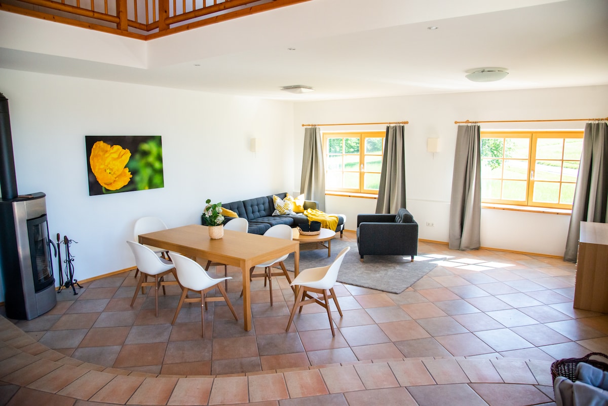 The accommodation is located on a quiet, secluded organic farm in the Salzburg region. It's ideal for rest and relaxation, but also for cycling or running in the heart of nature. Several beautiful, warm swimming lakes are located between 2 and 7 km away. The IBM Moor is approximately 5 km away. The loft has a bathroom, a kitchen with an induction hob, electric stove, and refrigerator. The sauna can be rented exclusively for a fee. We do not offer a transfer service.