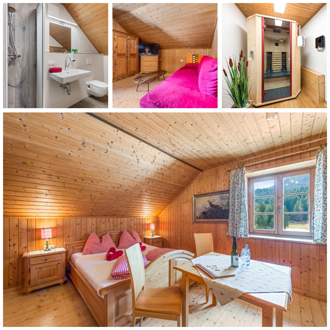 Die geräumigen Doppel-Zimmer können teilweise auch für 3 – 4 Personen bezogen werden und verfügen über folgende Ausstattung: – ausziehbare Couch - Flachbildfernseher – großes Bad mit Dusche, WC, Haarföhn, Hand- und Duschtücher – Parkettboden - Erweitertes Frühstück am Tisch serviert. - Ausblick in den Garten und Berglandschaft. - Kostenloses WLAN überall. - Parkplätze kostenlos. - Restaurant mit saisonaler steirisch-kärntnerischer Küche und Holzofen-Pizza; - Sauna und Whirlpool