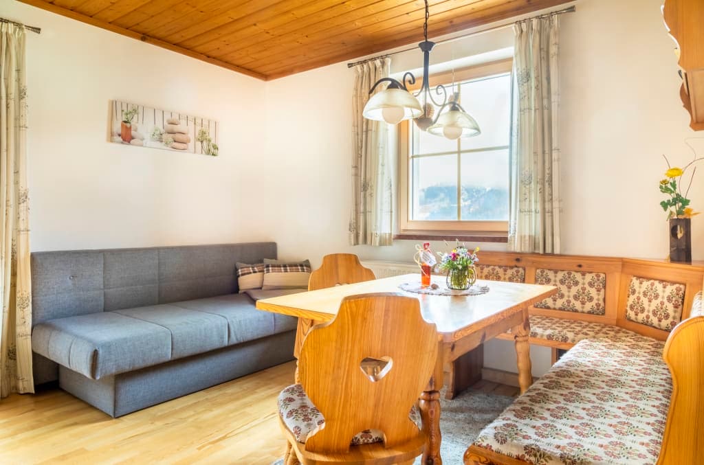 Auf 35m² bietet die Ferienwohnung Hubert jeglichen Komfort. Die Ferienwohnung besitzt eine voll ausgestatteter Küche. In dieser steht Ihnen zur Verfügung: Nespresso Kaffeemaschine, Backofen, Ceranfeld, Kühlschrank, Geschirr und Geschirrspüler. Von dort aus kommt man in das Schlafzimmer und in das Badezimmer. Im Winter wird in der gesamten Wohnung mit Fußbodenheizung geheizt. Eine Veranda auf der Südostseite lädt zum Morgenkaffee mit wunderschönem Blick auf Bergpanorama ein.