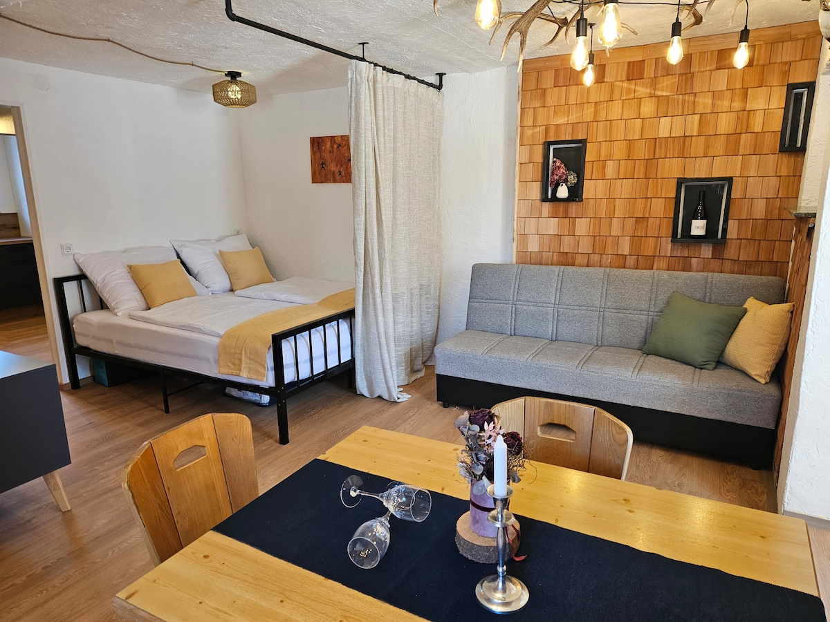 Appartement (Achtung ohne Küche) mit separatem Eingang in einer beschaulich ruhigen Ortschaft Du hast ein eigenes Bad und ein separates WC, kannst den Garten und dessen Sitzgelegenheiten mitbenützen und es gibt auch die Möglichkeit ein Frühstück zu buchen. Im Zimmer findest du eine Kaffeemaschine, einen Kühlschrank, eine kleine Auswahl an Geschirr für alle Fälle und einen mini Backofen. Der Essplatz mit zwei Stühlen kann auch als Arbeitsplatz genutzt werden.