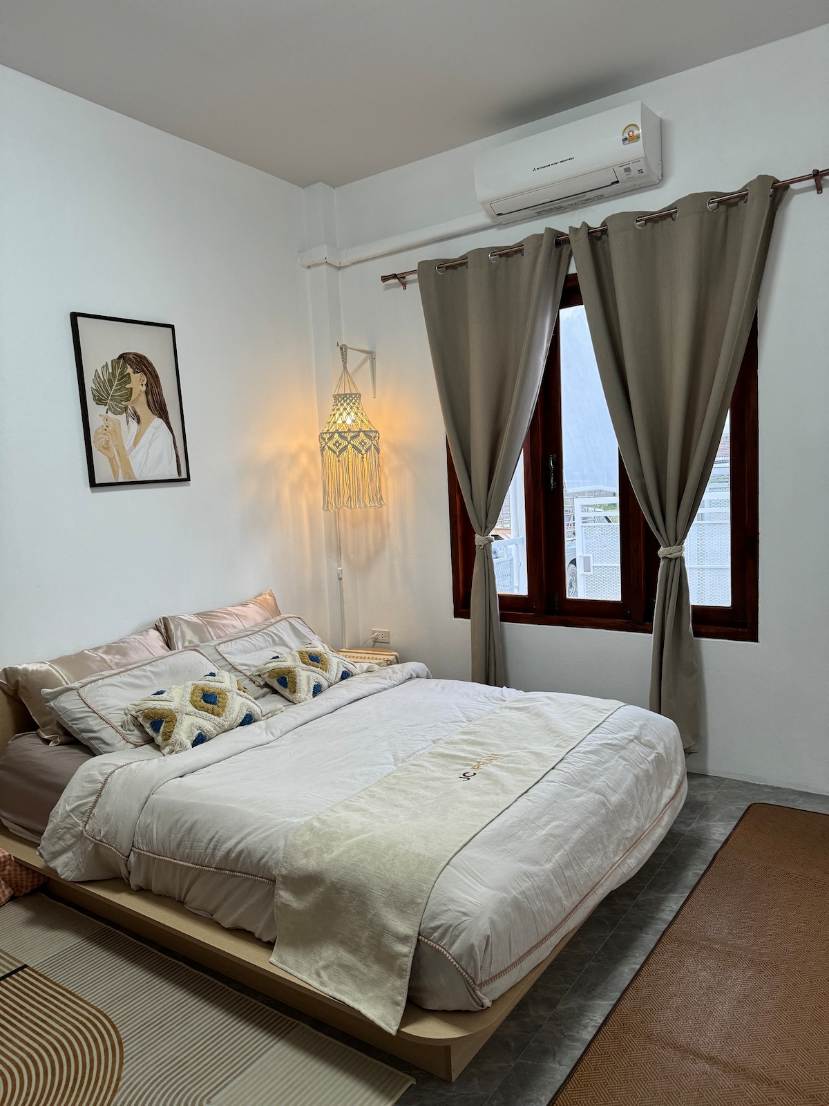 Our townhouse is situated in a quiet tropical village a few minute walk from the beach. Fully renovated in April 2023 it features modern design, thought-out layout, 2 new air-conditioners and hand-painted murals that will make your photos pop! In 60 sqm there is living room with smart TV, designated working desk, fully equipped kitchen with microwave, oven and coffee machine, dining zone, bedroom with new king mattress, bathroom with rain shower, balcony. In front of the house is a loop pool.