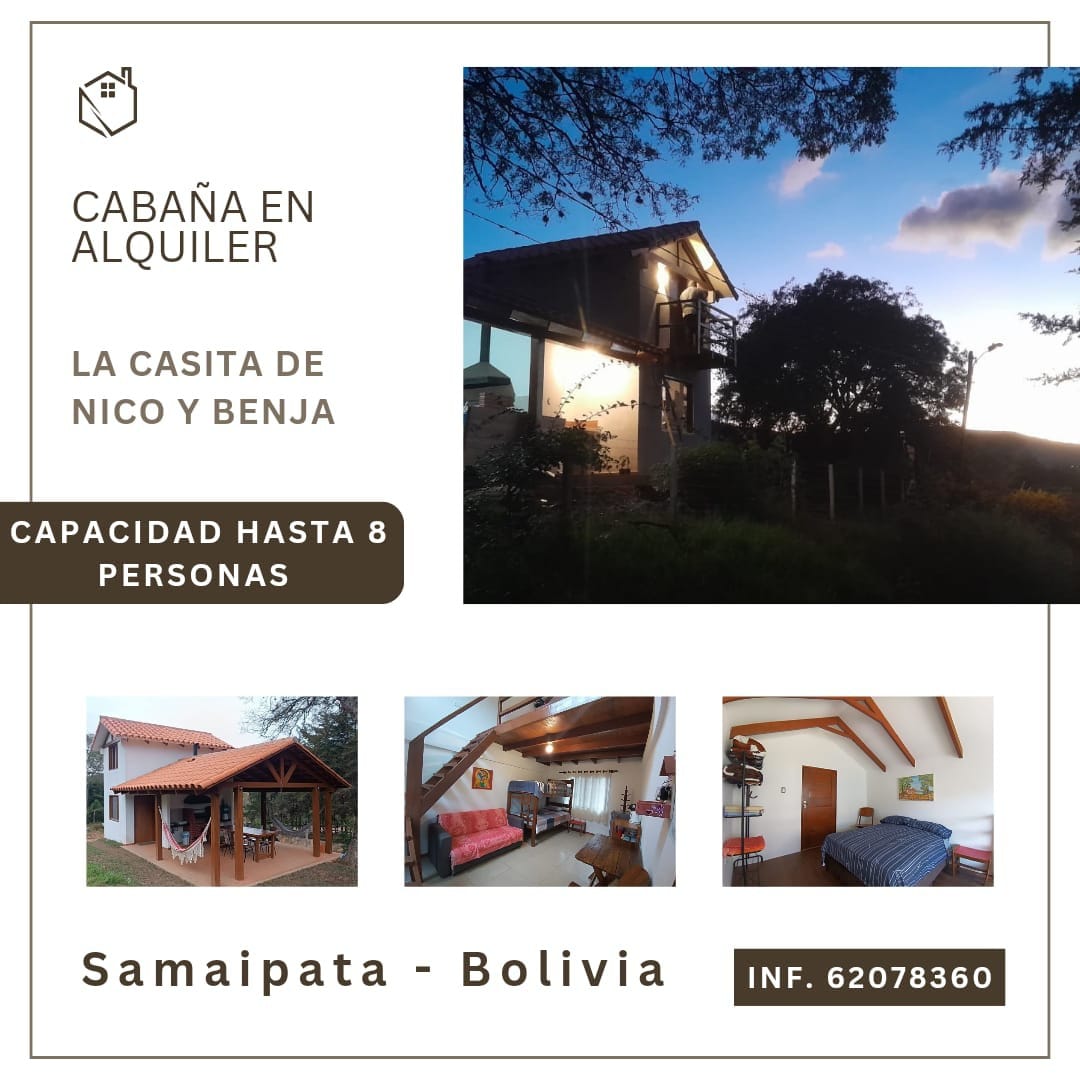 Bella cabaña perfecto para días de descanso. Cuenta con diferentes muebles, habitaciones para hospedar hasta 6 personas, sala, cocina, 2 baños, además de contar con garaje privado para hasta 2 vehículos, wifi, parrilla, hamaca, entre otros. La cabaña se ubica en un lugar tranquilo y espacioso, con vistas hermosas desde las terrazas, además de que se encuentra a 7 cuadras de la plaza central, por lo que podrá disfrutar de una experiencia completa que el pueblo de Samaipata puede ofrecer.