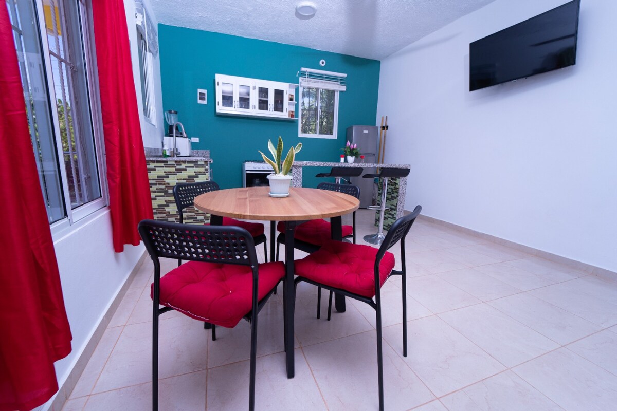 oferta de lanzamiento excepcional Apartamento tropical con 1 habitaciones en el centro de Las Terrenas. Cocina equipada, baño privado, aire acondicionado, TV y WiFi Starlink ultra rápido, ideal para nómadas digitales. Espacio amplio, cómodo y luminoso. A menos de 10 minutos de la playa y cerca de restaurantes, bares y supermercados. Disfruta del rooftop con bar abierto de 17:00 a medianoche en ambiente chill. Perfecto para parejas, amigos o estancias largas.