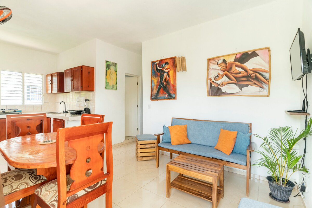 Magnifique appartement 2 pièces× entrée +terrasse +jardinet la chambre est en mezzanine .L appartement à été refait à neuf;électroménager neuf et complet. Dans résidence très calme et tranquille à quelques mètres seulement de la plage et à moins de 500 mètres du centre touristique de Las Terrenas. Reseau internet par fibre Litterie neuve et de bonne qualite. Smart TV A proximité de restaurants et bars Parking privatif gratuit et gardé de nuit.Accès avec télécommande