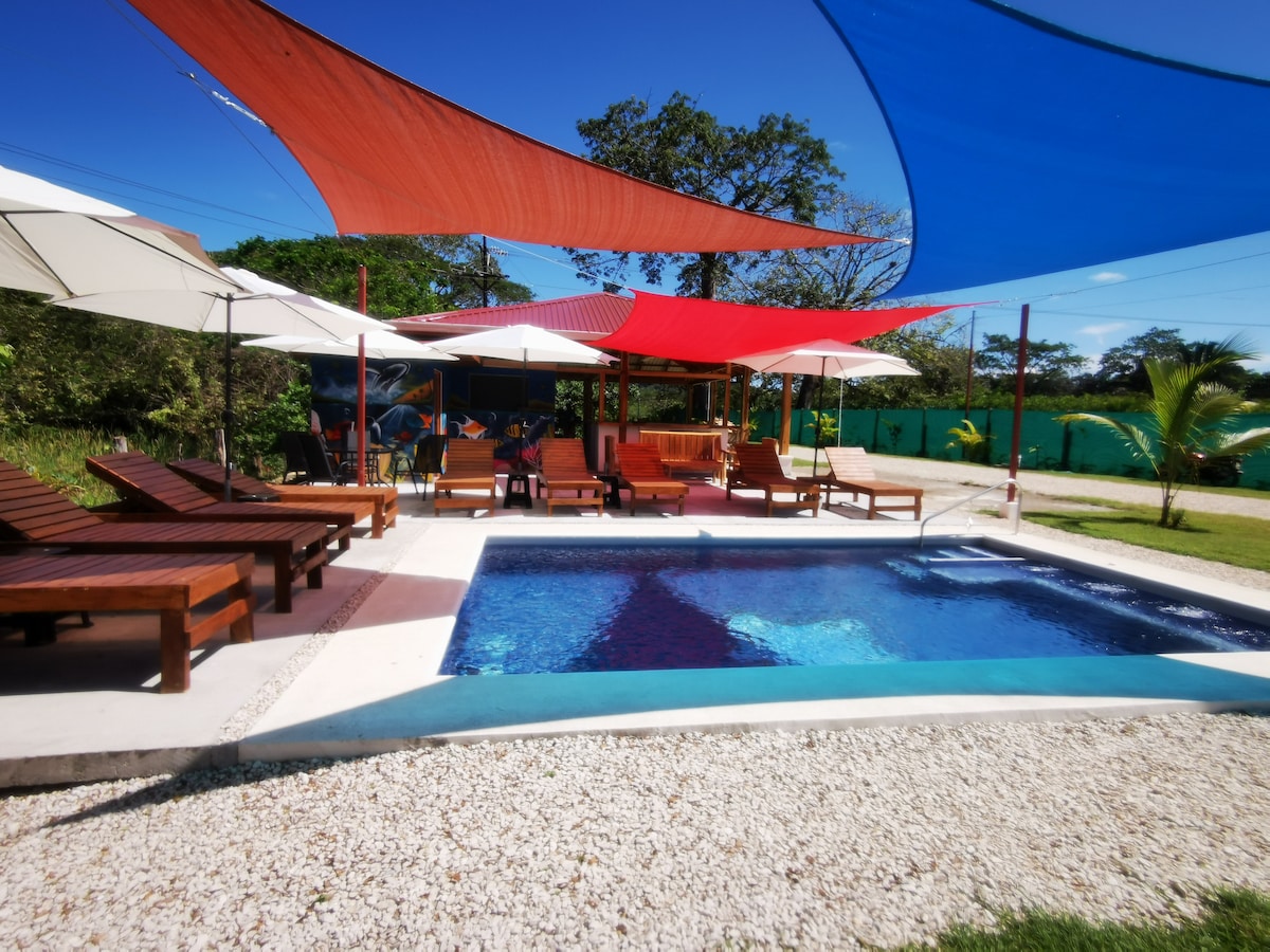 A laid-back private room 2-minute walk from Playa Guiones and set on the property of a local surf resort. Each room has its own entrance and patio. On-site you’ll find a pool, open-air rancho, café, and surf shop (providing rentals and lessons). More restaurants and shopping are a short stroll away. This room is ideal for solo travelers, surfers, couples, or small groups looking to enjoy the beach, jungle, and local surf scene. This is Cabina #6 on our property.