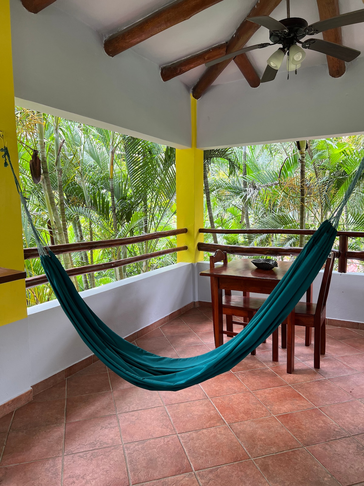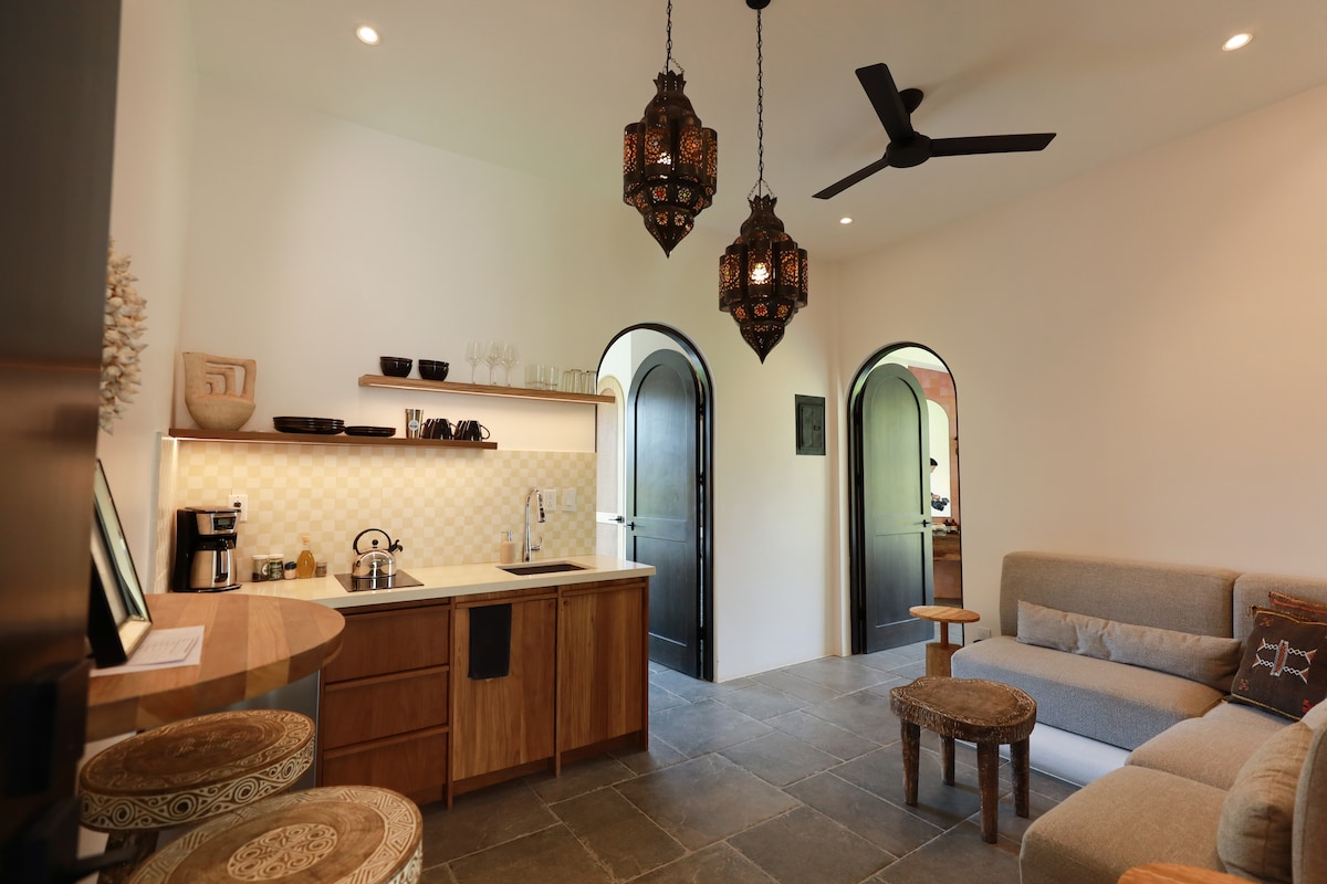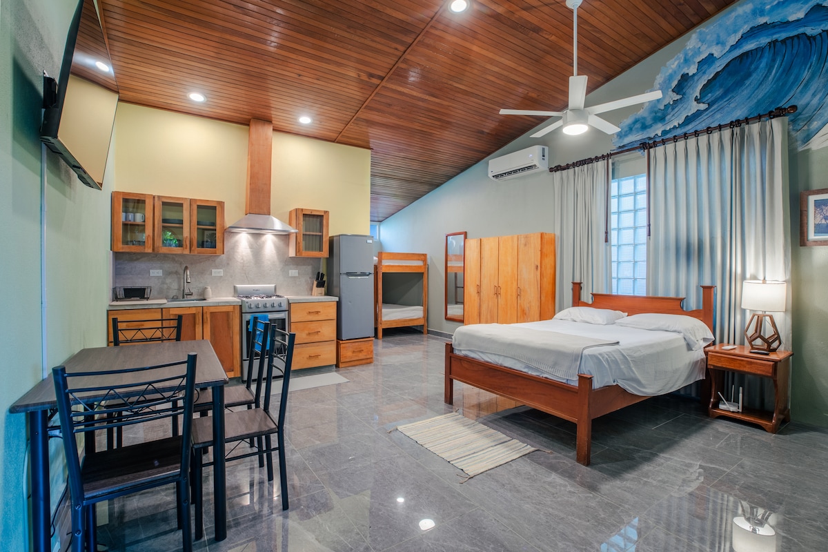 A spacious open-concept studio that's a 2-minute walk to Guiones beach. Features WiFi, TV, A/C, full kitchenette with oven, and covered patio surrounded by tropical gardens. Set on the property of our local surf resort, on-site you’ll also find a pool, open-air rancho, café, and surf shop (providing rentals and lessons). More restaurants and shopping are a short stroll away. Ideal for solo travelers, surfers, couples, families or small groups looking to enjoy our beautiful surf town in Nosara.