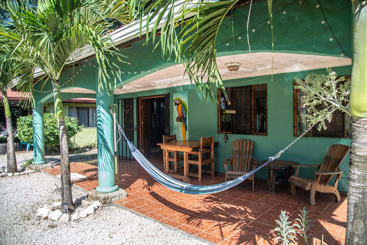 Escape to our enchanting wooden house in the Costa Rican jungle, a mere 5-min drive from breathtaking Puerto Carrillo Beach. Sleep under the stars in our third-floor 'treehouse' bedroom, a panoramic view of the tree canopy, comfortably enclosed in a mosquito net. Immerse yourself in nature, just 3 mins from local amenities. Perfect for Christmas, New Year (min 1-week stay), and Easter escapes (min 4 days). Experience the blissful blend of beach relaxation and jungle adventure!