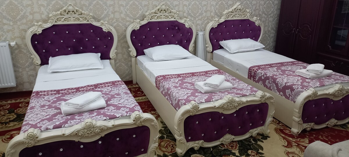 Stay just 2 minutes from Registan Square in your own private 3-bedroom house — ideal for families or small groups. 🛏 1 double bed, 5 single beds, 1 sofa 🍽 Kitchen with multicooker, microwave, essentials 🚿 2 bathrooms (shower + separate toilet) 🌐 Fast Wi-Fi, A/C, washing machine 🚗 Free parking, private entrance, quiet area Explore Samarkand on foot — major sights, cafés, and shops are all within walking distance. 💬 Hosted by locals — personal tips and help available upon request!