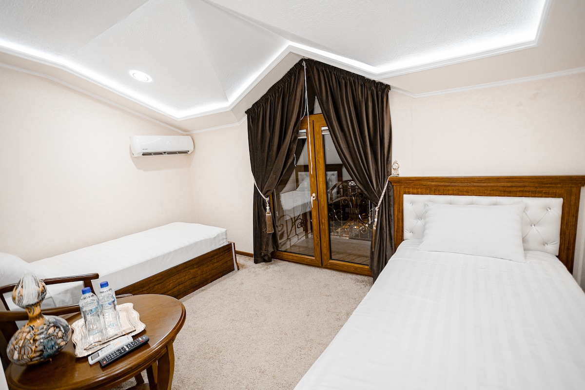 Уютный трехместный номер с тремя односпальными кроватями и собственной ванной (душ + туалет). Есть кондиционер, Wi-Fi, постельное бельё и полотенца. Общая кухня оборудована всем необходимым. На крыше — веранда с видом на легендарный Регистан, где приятно завтракать на свежем воздухе. Бесплатная парковка, тихий район, 3 минуты пешком до Регистана.