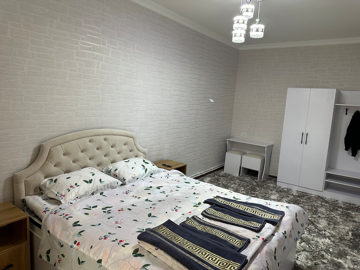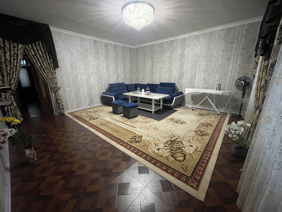 - The location is 15 minutes away by car from Airport, Train station, and Registan. (20 min. walking for Registan) - Big supermarkets, traditional eating restaurants, and cafes are 4 minutes away on foot. - Sleeping arrangement: (6 guests) Bedroom1: 1 double bed (2 guests), Bedroom 2: 2 single beds (2 guests), Living room: sofa bed+ floor mattress (2 guests). -1 full bathroom and kitchen - Big TV and fast Wi-Fi -Washing machine, iron -Hot, cold water, shampoo, hair dryer -Free parking area