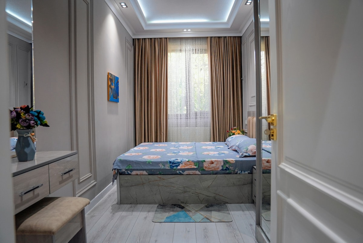 Welcome to this charming one-bedroom apartment nestled within the newly constructed building in the heart of Smartcity, Samarkand. Conveniently located on the ground floor, accessibility is a breeze with no need for lifts. The apartment boasts windows fitted with mosquito nets, ensuring serene evenings free from unwelcome guests. Fully furnished to meet your needs, it features modern amenities including air conditioning, a television and microwave. We can also assist with tourist registration.