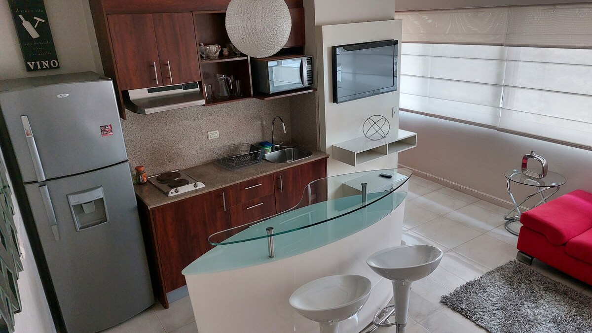 Suite full amoblada y renovada ideal para extranjeros y ejecutivos. Acabados de lujo. Cama queen size, sofá cama, smart-tv en sala y habitacion, wi-fi. Queda ubicado en una las zonas mas prestigiosas y a 3 minutos del aeropuerto. Cuenta con recepción disponible 24h. Cerca de cines, bancos, restaurantes, hoteles, supermercados, hospital y centros comerciales. Tiene lavadora y secadora, cocina eléctrica, refrigeradora, microondas, cafetera, tostadora y utensilios de cocina.