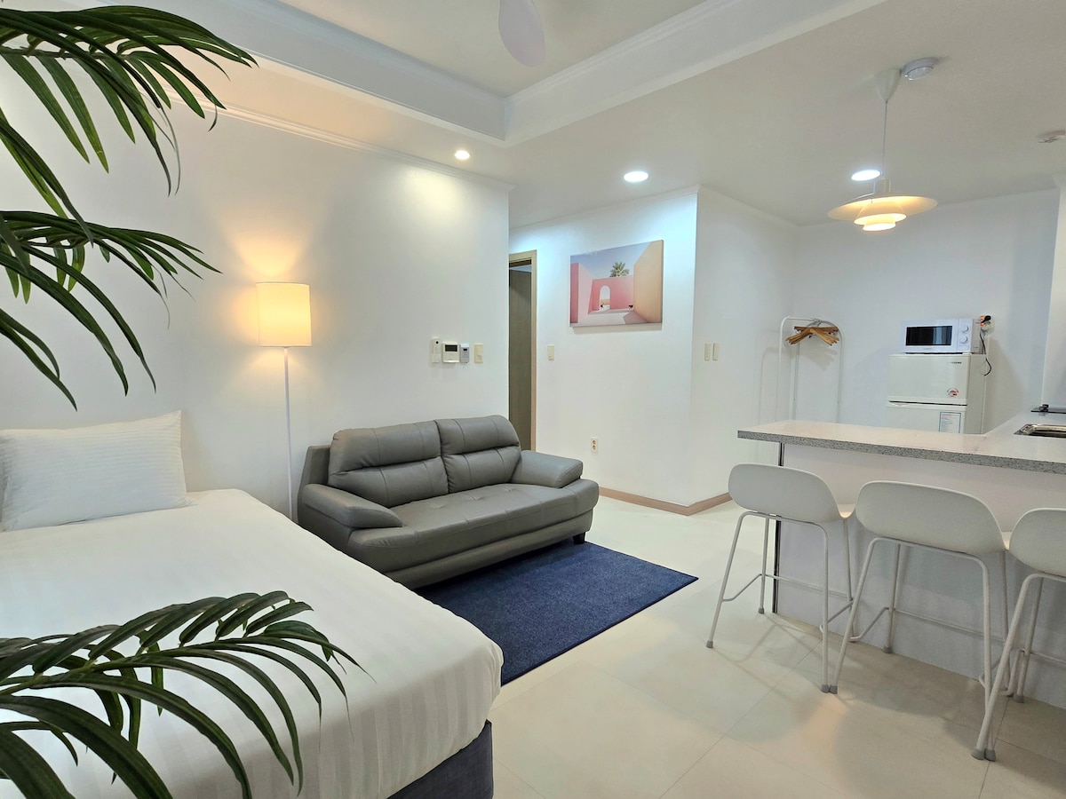 공항에서 15분 거리로 제주시청 앞에 위치해 있습니다. 대중교통이 매우 편리합니다. 번화가에 있어서 주변 상가와 식당을 이용하시기에도 편리합니다. 숙소 - 조식은 제공되지 않습니다. 간단한 조리를 하실 수 있도록 공용 주방이 마련되어 있습니다. 조리 도구와 식기, 인덕션, 냉장고, 밥솥, 전자레인지, 커피포트, 냉온 정수기 등을 사용하실 수 있습니다. - 지하 세탁실에 세탁기와 건조기(유료3000원 현금, 계좌이체 가능)가 준비되어 있습니다. 기타 주의사항 - 객실 내 가구의 배열과 구조는 조금씩 달라질 수 있습니다. - 보다 깨끗한 객실 관리를 위해 체크아웃 시간(11시)을 지켜주시기 바랍니다. - 숙소 전 구역은 절대 금연입니다. - 밤 10시 이후에는 절대 정숙 부탁드립니다. - 시설과 비품의 오염 및 파손, 분실이 있을 경우 비용은 모두 게스트에게 청구됩니다. - 침구 오염 시 동일 제품의 구매 가격을 청구 드리니 오염에 주의하여 주세요.