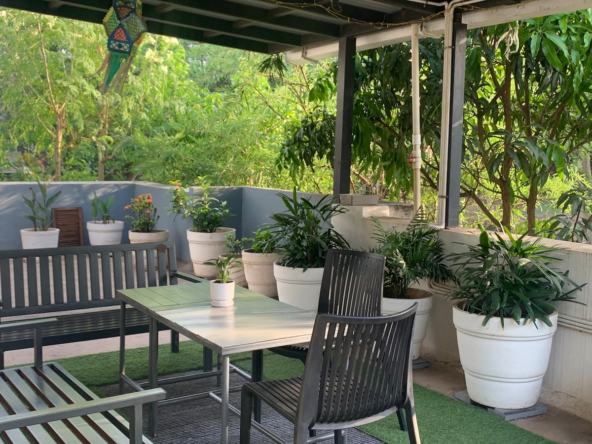 Courtyard Breeze is a peaceful ground floor stay with a private outdoor sitting area, perfect for relaxing with your morning chai or evening breeze. The home features a comfortable living space and a kitchen equipped for basic cooking with essential cutlery. Ideal for a calm and cozy city stay. Your will be close to everything when you stay at this centrally-located place.