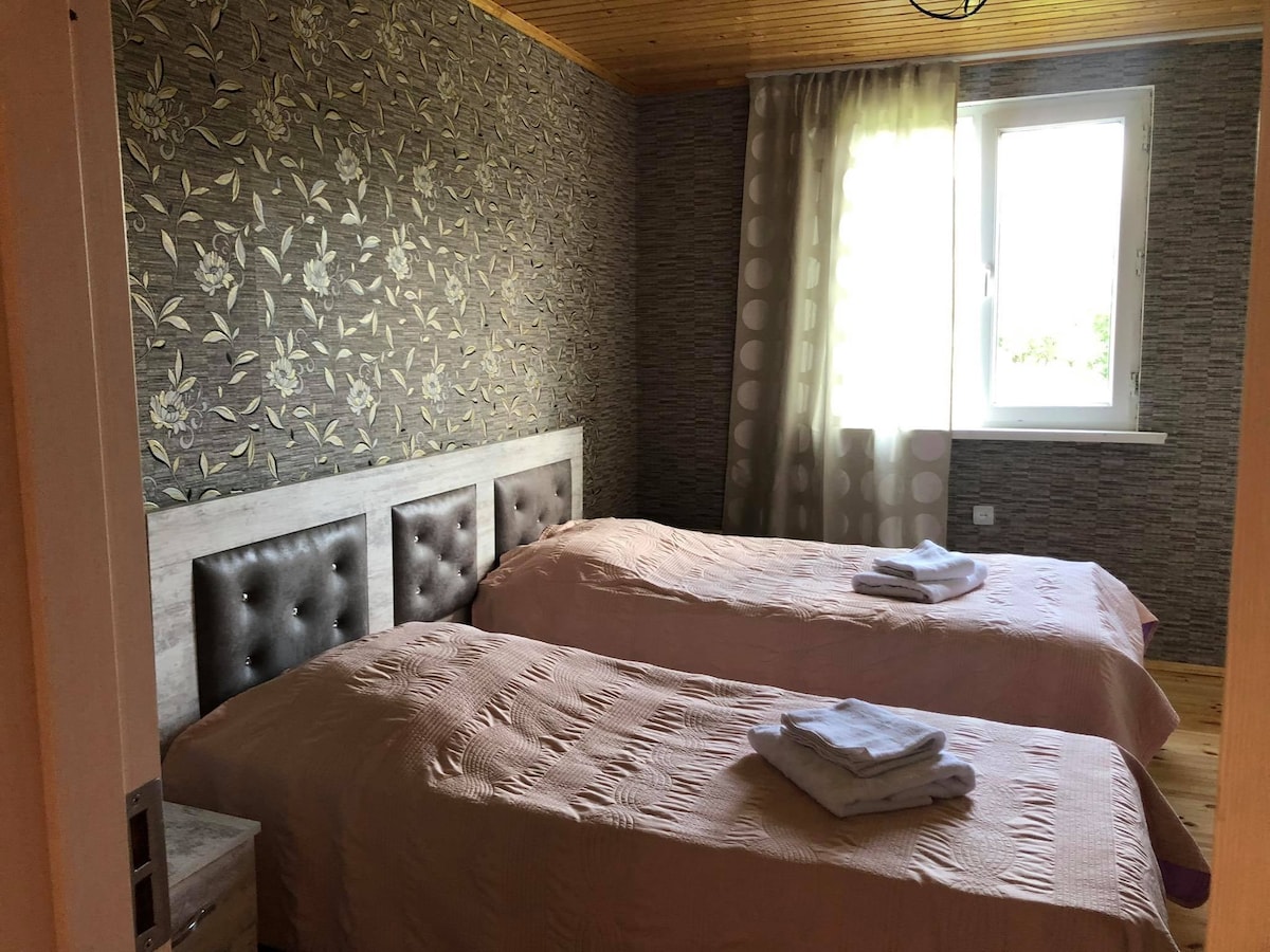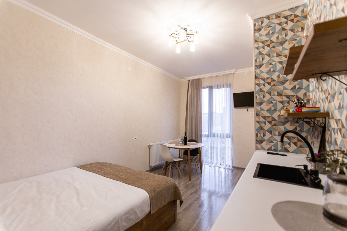Enjoy a stylish stay from very close to the city center(4 km) NEW apartment on the 1st floor with terrace and green beautiful garden view. The guest will find fully furnished, well illuminated apartments, with all amenities guest might need for a short stay or a long sojourn! The space is equipped with fridge, kettle, handmade (by me)) nature wooden accessories and all necessary amenities for comfortable stay) FREE Airport transfer from Kutaisi Airport can be done if you book 7 or more days!