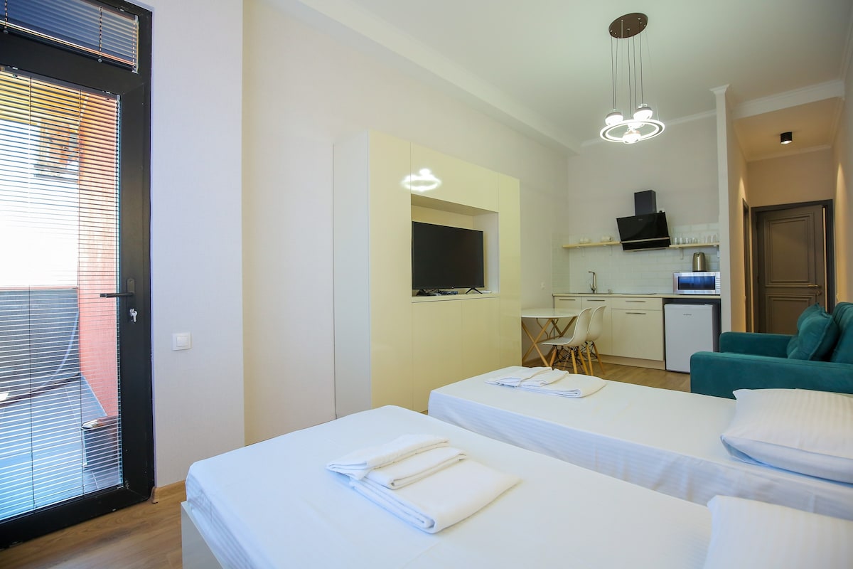 Enjoy a stylish stay in the heart of the city, 450 meters from the Colha Fountain in the city's central square. Here you will feel coziness and silence, luxury, comfort, warmth and convenience. Our apartment is located 100 meters from the house museum of the great Georgian composer, Zakharia Paliashvili.