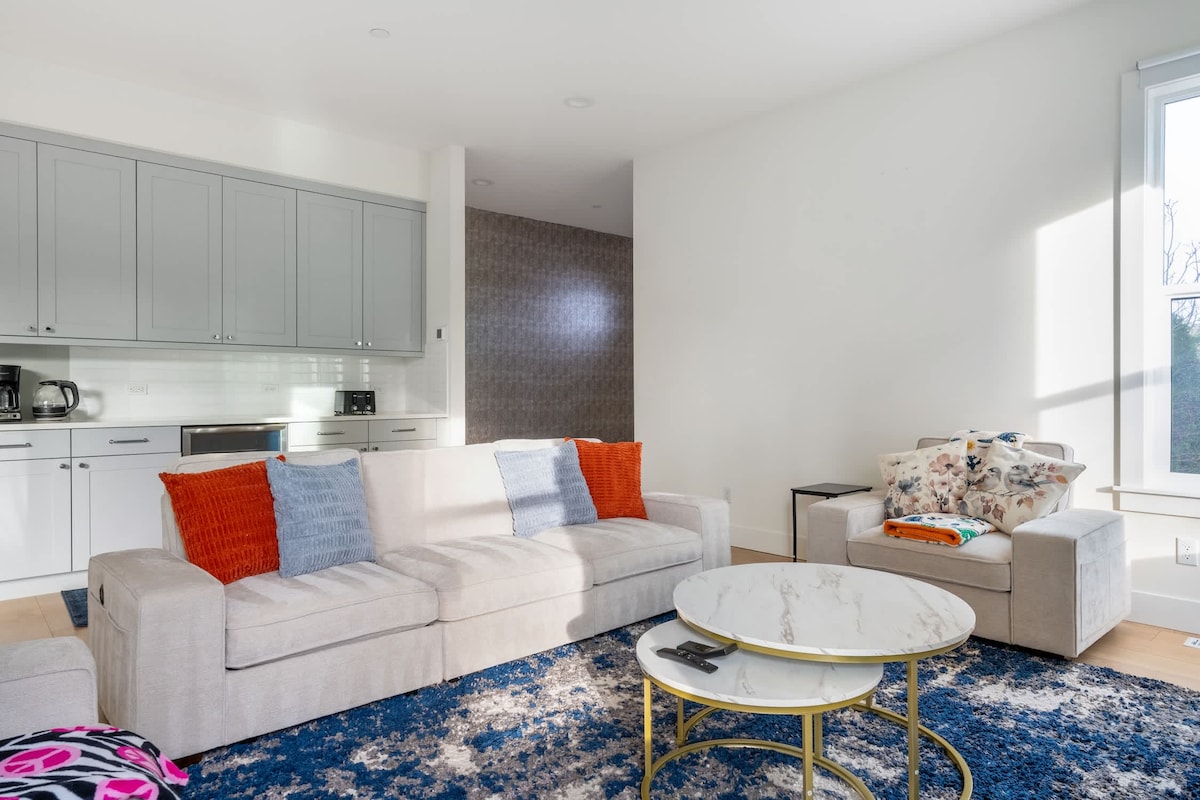 New Construction 1 bed apartment in Downtown Kirkland! Custom cabinets, quartz counters & stainless appliances! Beautiful salvaged & refinished fir flooring. Adorable bath w/ basket weave tile & soapstone counter! Private washer & dryer. WIFI & Smart TV. Vaulted ceilings, skylights & AC! This completely separate & private new construction apartment was completed in 2020 and is located above our detached garage. Perfect for short or long term stays. Live in the heart of Kirkland!