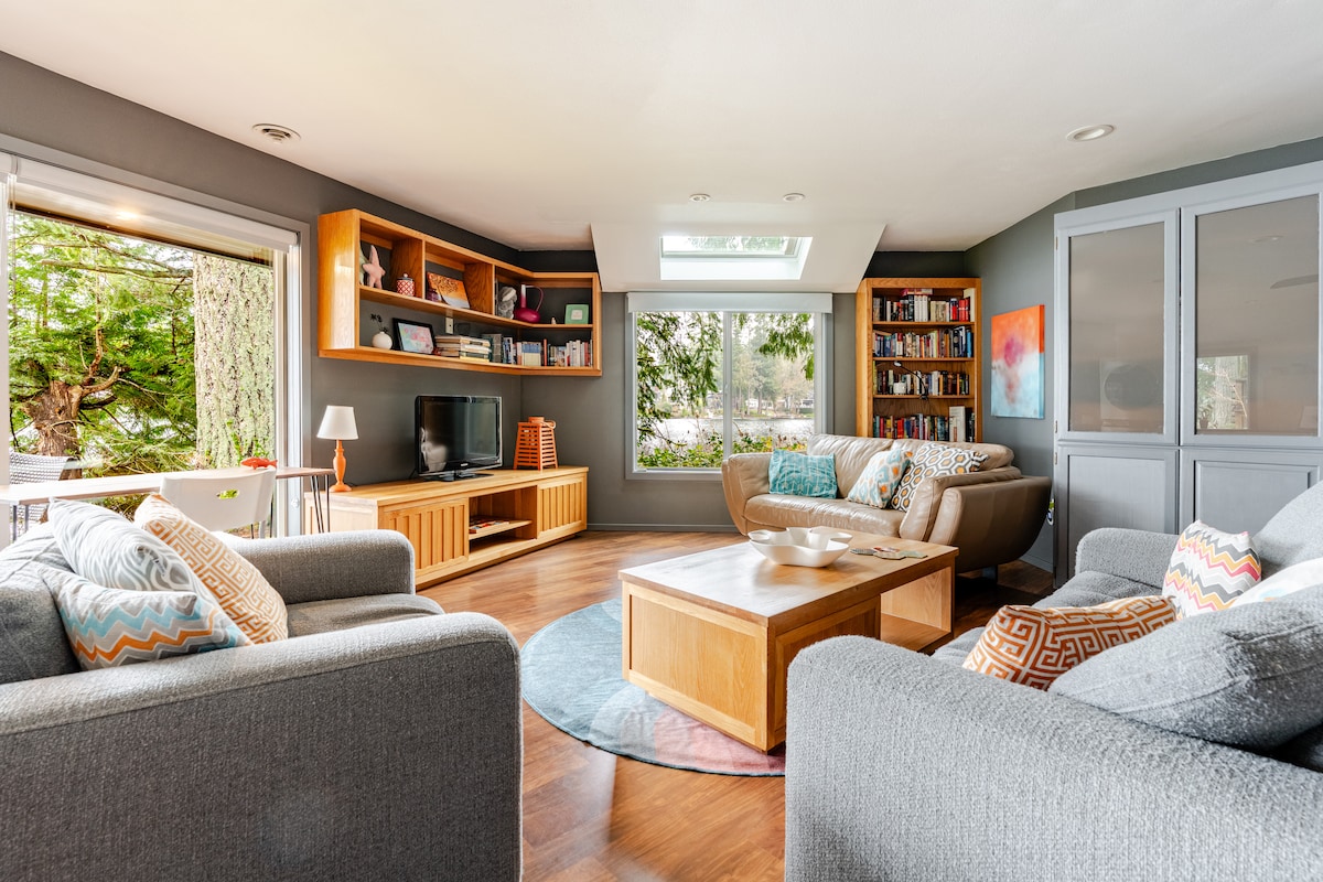 Modern farmhouse cottage on Lake Sammamish—2 bed / 2 bath with A/C and gas fireplace. Both bedrooms feature plush down comforters and pillows. Enjoy hardwood floors, a well-equipped kitchen with new appliances, washer/dryer, dining for 6, a sleeper sofa, 55” TV, and coffee bar. Relax with lakeview dining, kayak the shoreline, or explore the Lake Sammamish Trail just outside your door. Well-behaved dogs welcome!