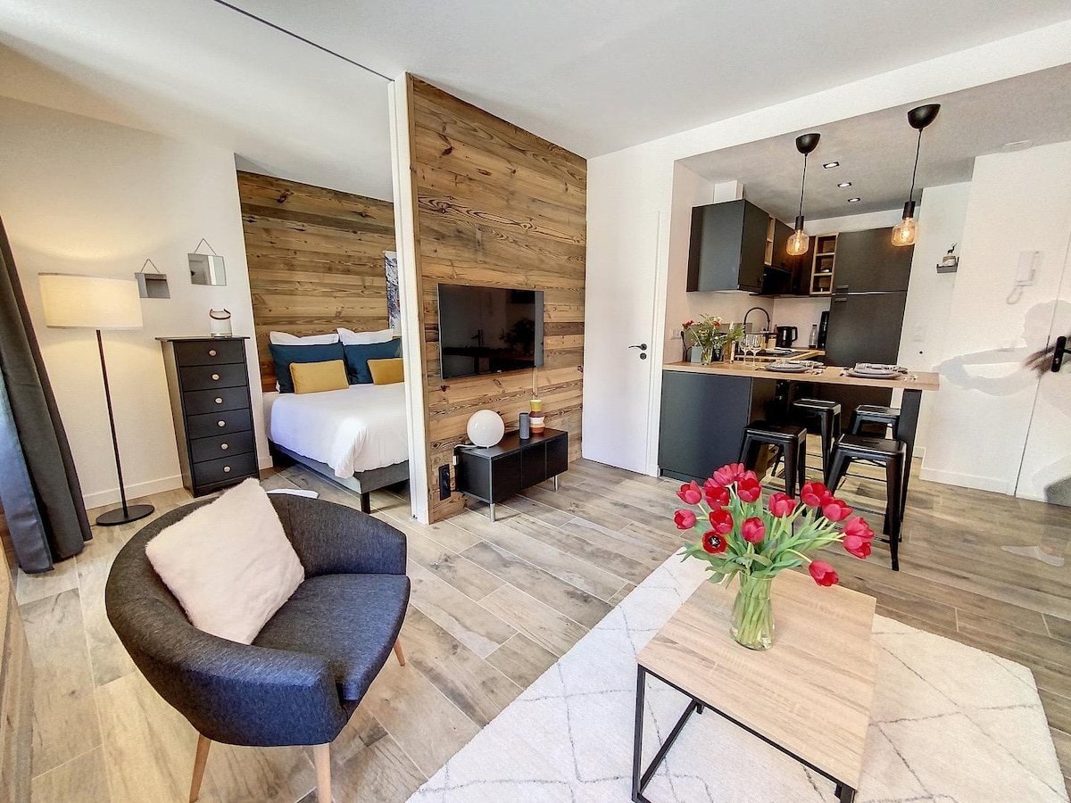 Incredible cocoon in the heart of Chamonix! L'Abri Vallot will seduce you with its location and decoration in a contemporary mountain style! Enjoy a private terrace with a sofa and a view of the glaciers and Mont-Blanc summit! A separate bedroom with a very comfortable double bed (separable into two single beds), a kitchen equipped with all the appliances! The walk-in shower to start a great day!