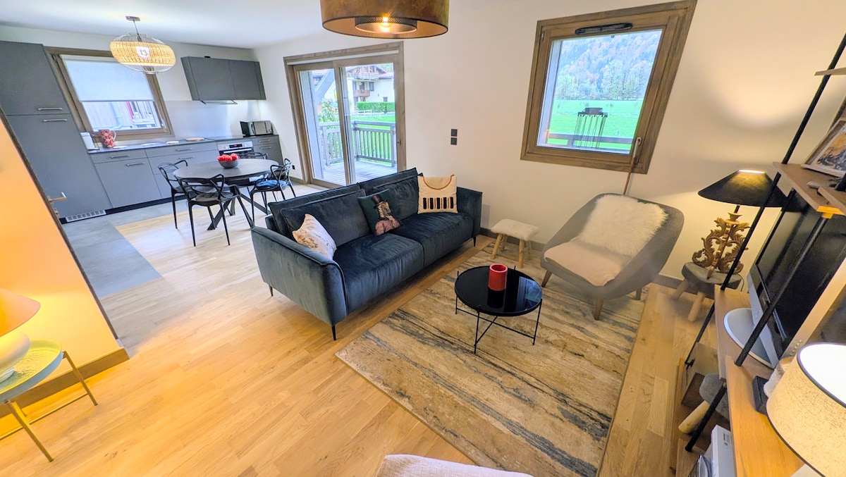 This duplex apartment of 200 m², completely renovated in 2017 by an architect, located in an old farmhouse can accommodate up to 14 people with 5 bedrooms with en-suite. It has a covered terrace, facing south offering a panoramic view on the valley, a private parking for 5 vehicles and a ski-room with a boot warmer. It is 4 minutes from the center of Samoëns and a 5-minute drive away from the nearest ski lift. During school holidays renting only from Saturday to Saturday.