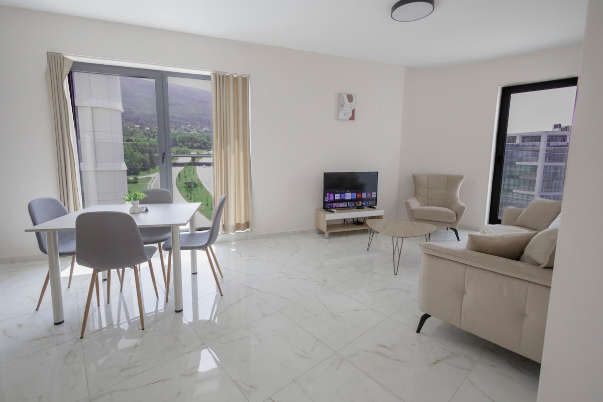 A brand new inviting apartment with a great view of Vitosha mountain. Furnished in a contemporary interior style, which makes it feels airy and spacious. The apartment is located in a private complex, on the 9th floor. A cozy and comfortable place! Just 8min walk from Inter Expo Subway Station and 10min away from the city center by car. It is also convenient to get to the airport, both by subway and taxi.