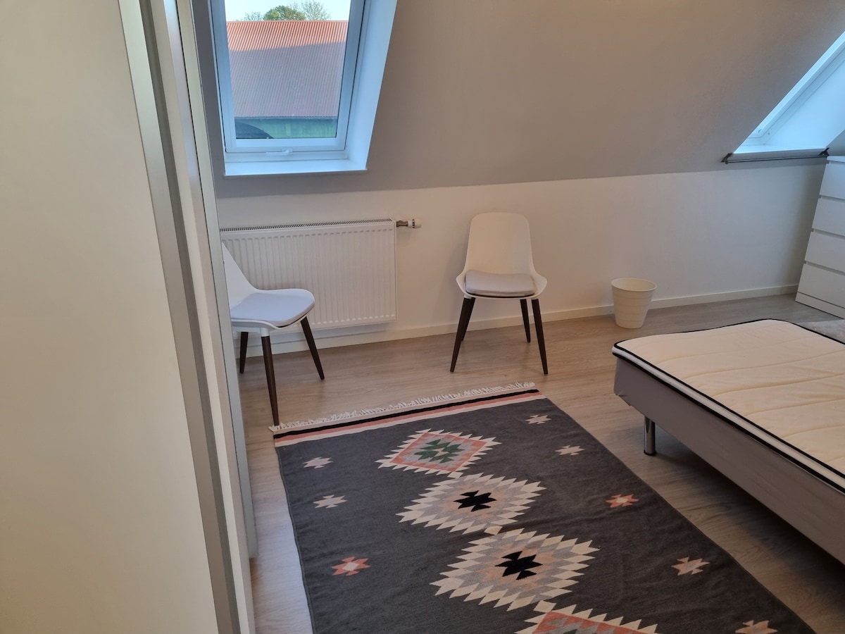 Moderne selvstændig lejlighed i sydenden af skøn rolig landejendom. 2 værelser med 2x90cm senge som dobbeltseng i haveværelset og 1 stk 140cm dobbeltseng plus god sovesofa i markværelset. Køkken med moderne faciliteter og 5 spisepladser samt lille sofa. Adgang til egen terrasse med grill og fælles have. Badeværelse med brus og pusleplads. Skøn udsigt over have og marker. Bålplads, bakke med udsigt, 850 m til skøn badestrand. Vi har høns, biavl og øko-fåreavl på gården. El-bil lader 11W.