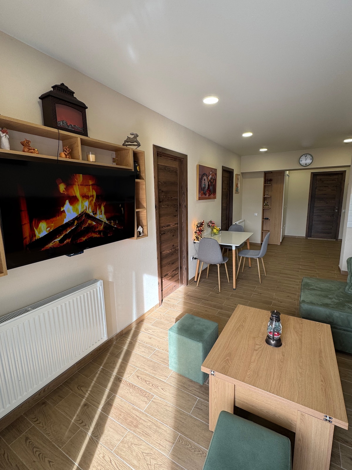 Magnificent and cozy studio style apartment. Fully renovated with modern furniture and amenities for maximum comfort. Harmonious nature with exterior and interior to match, perfect for peaceful vacation and warm memories. Cozy balcony with a view over a pine forest that provides fresh air and natural harmony on every season. ski-in/ski-out, just seconds away from newly renovated Kokhta lift + ski storage. Unit comes with a small kitchenette + amenities, TV, Wi-Fi, washing machine and etc.