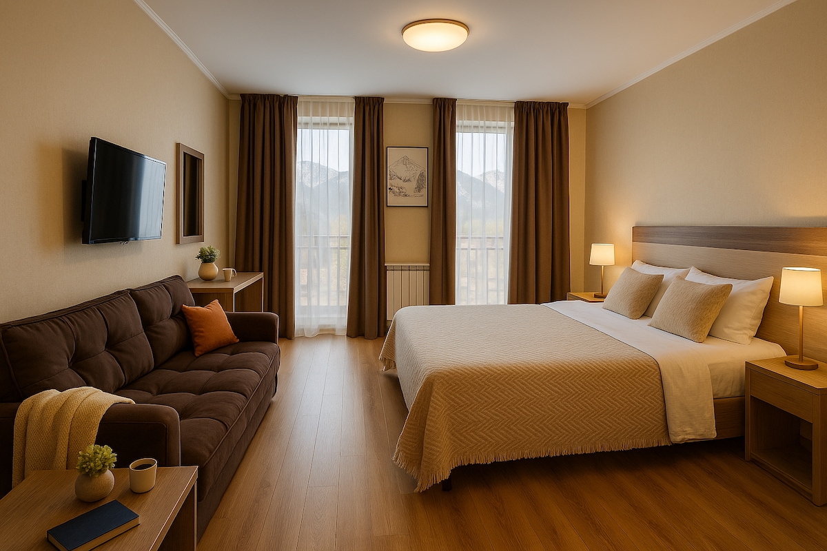 Hotel in Borjomi, the ideal place for your vacation! Become a guest of a hotel in Borjomi, where the beauty of nature and modern comfort harmoniously combine. Our hotel is distinguished by its unique location and natural landscapes of Borjomi, which provide outstanding views from each room. The hotel's interior is designed with modern design elements and is also equipped with high-quality furniture and lighting. Our team is ready to host you and make your trip unforgettable.